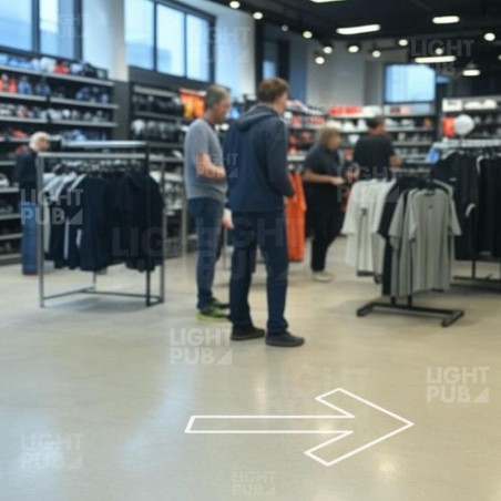 El proyector de flechas de suelo está diseñado para atraer la atención y mejorar el flujo de tráfico en sus puntos de venta. Encaja perfectamente en una estrategia de merchandising moderna, guiando a sus clientes hacia las áreas clave: nuevos productos, ofertas especiales, superventas o departamentos de temporada.